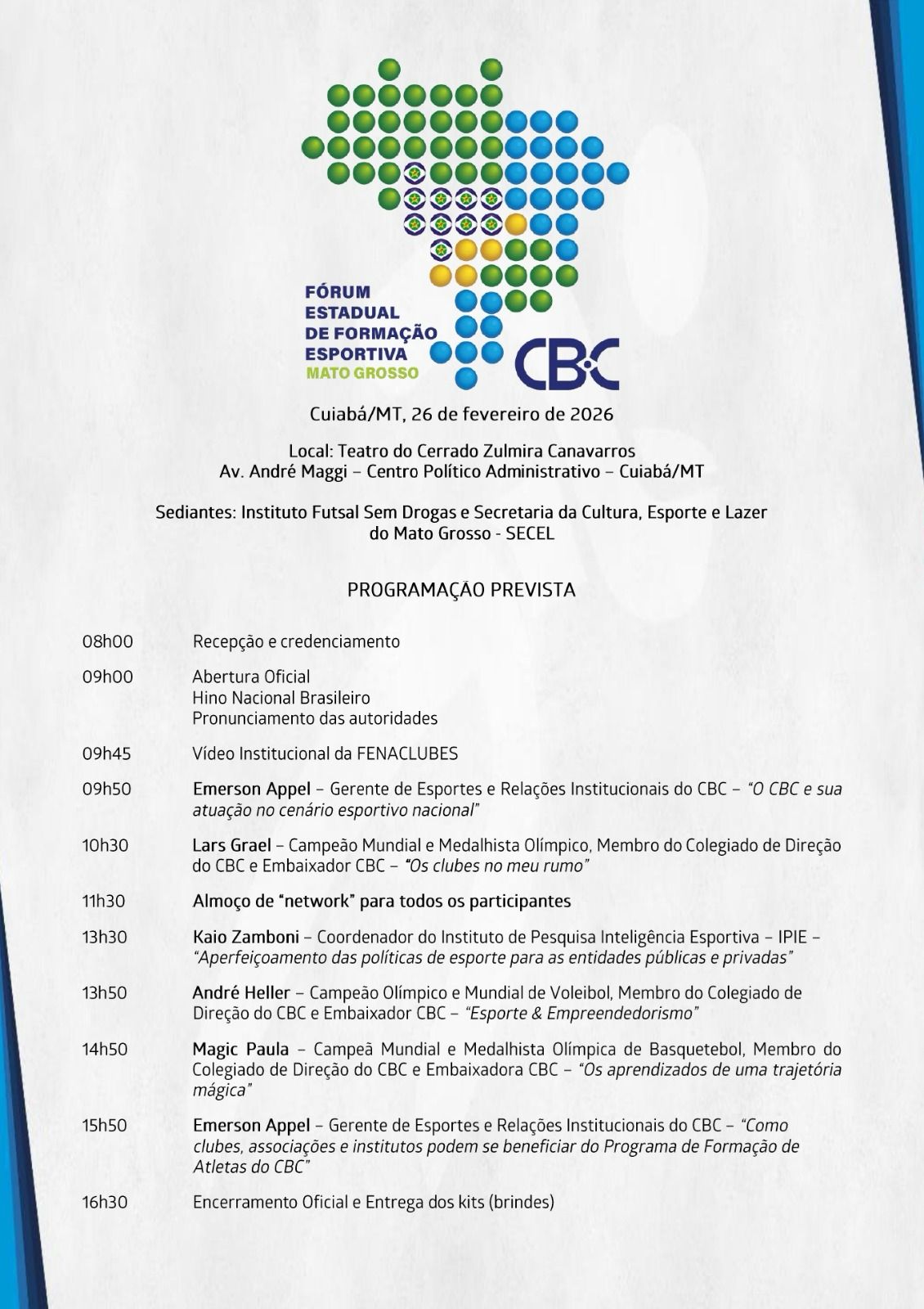 Capacitação direcionada à comunidade esportiva mato-grossense, com foco em temas como gestão esportiva, governança, transparência e captação de recursos federais